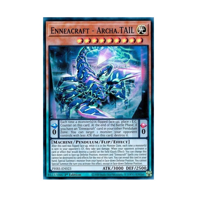 Texto (EN): Pendulum Effect Each time a monster(s) is flipped face-up, place 1 E.C. Counter on this card. At the end of the Battle Phase, if you have an "Enneacraft" card in your other Pendulum Zone: You can target 1 monster your opponent controls with less ATK than this card; destroy it. Monster Effect After this card was flipped face-up, while it is in the Monster Zone, each time a monster(s) is sent to your opponent's GY, they take 900 damage. When your opponent activates a card or effect that would destroy a card(s) on the field (Quick Effect): You can change this face-down card to face-up Defense Position; monsters and "Enneacraft" Spells you control cannot be destroyed by card effects for the rest of this turn. You can reveal this card in your hand; Special Summon 1 monster from your hand in face-down Defense Position. You cannot Special Summon the turn you activate this effect, except in face-down Defense Position.