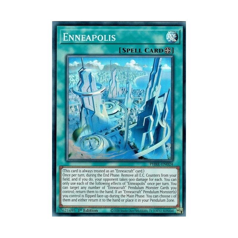 Texto (EN): (This card is always treated as an "Enneacraft" card.) Once per turn, during the End Phase: Remove all E.C. Counters from your field, and if you do, your opponent takes 900 damage for each. You can only use each of the following effects of "Enneapolis" once per turn. You can target any number of "Enneacraft" Pendulum Monster Cards you control; return them to the hand. If an "Enneacraft" Pendulum Monster(s) you control is flipped face-up during the Main Phase: You can choose 1 of them and either return it to the hand or place it in your Pendulum Zone.