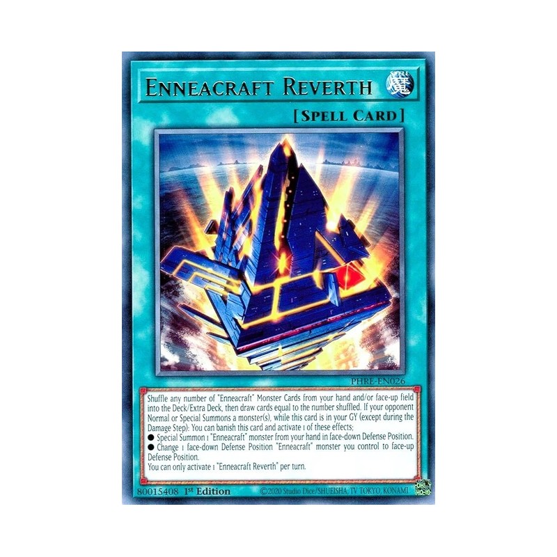 Texto (EN): Shuffle any number of "Enneacraft" Monster Cards from your hand and/or face-up field into the Deck/Extra Deck, then draw cards equal to the number shuffled. If your opponent Normal or Special Summons a monster(s), while this card is in your GY (except during the Damage Step): You can banish this card and activate 1 of these effects; ● Special Summon 1 "Enneacraft" monster from your hand in face-down Defense Position. ● Change 1 face-down Defense Position "Enneacraft" monster you control to face-up Defense Position. You can only activate 1 "Enneacraft Reverth" per turn.