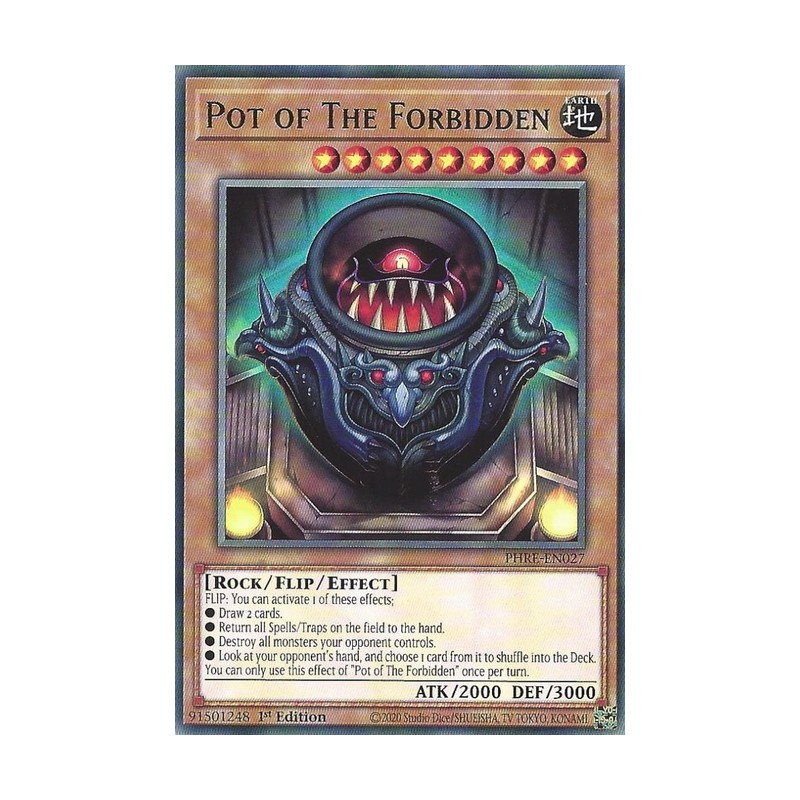Texto (EN): FLIP: You can activate 1 of these effects; ● Draw 2 cards. ● Return all Spell and Trap Cards on the field to the hand. ● Destroy all monsters your opponent controls. ● Look at your opponent's hand, also shuffle 1 card from their hand into the Deck. You can only use this effect of "Pot of The Forbidden" once per turn.