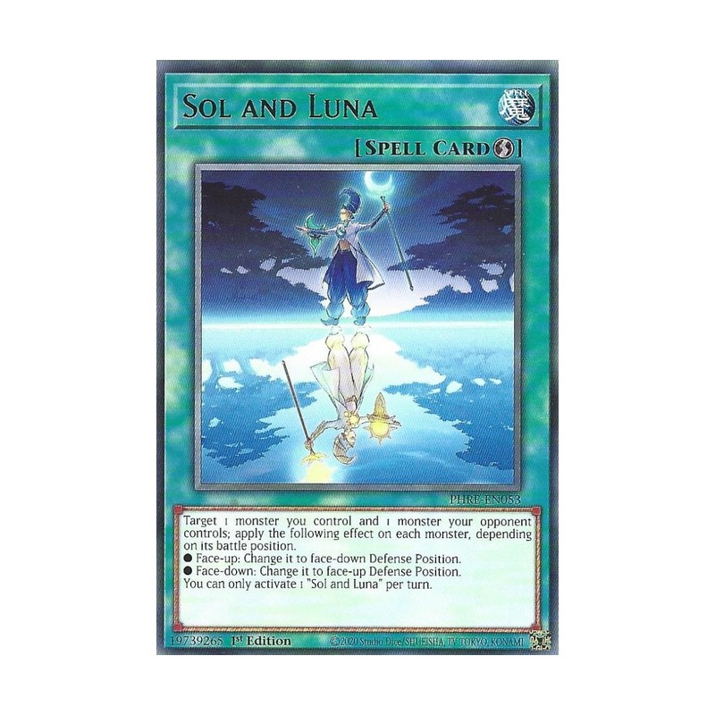 Texto (EN): Target 1 monster you control and 1 monster your opponent controls; apply the following effect on each monster, depending on its battle position. ● Face-up: Change it to face-down Defense Position. ● Face-down: Change it to face-up Defense Position. You can only activate 1 "Sol and Luna" per turn.