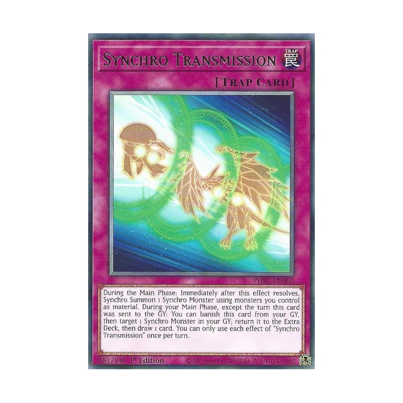 Texto (EN): During the Main Phase: Immediately after this effect resolves, Synchro Summon 1 Synchro Monster using monsters you control as material. During your Main Phase, except the turn this card was sent to the GY: You can banish this card from your GY, then target 1 Synchro Monster in your GY; return it to the Extra Deck, then draw 1 card. You can only use each effect of "Synchro Transmission" once per turn.