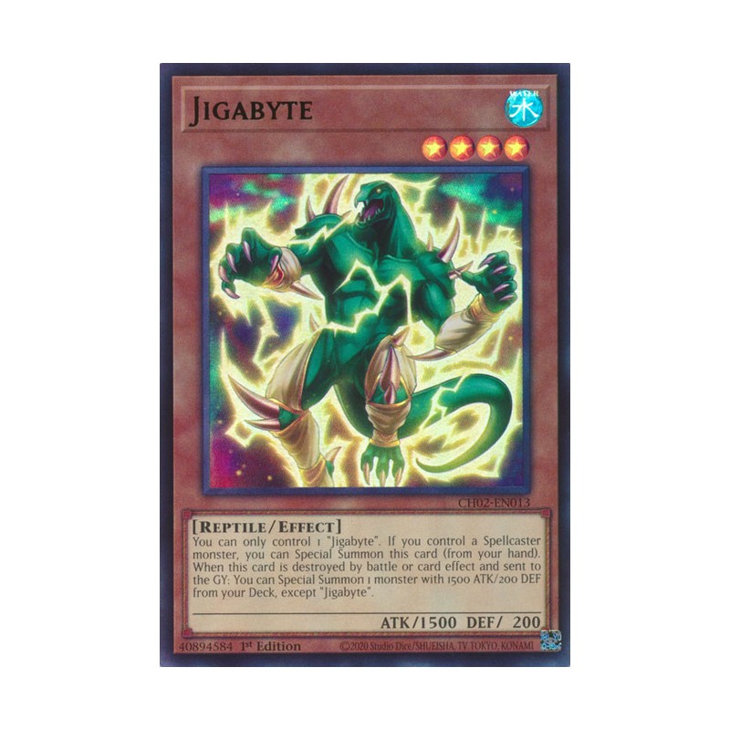 Texto (EN): You can only control 1 "Jigabyte". If you control a Spellcaster monster, you can Special Summon this card (from your hand). When this card is destroyed by battle or card effect and sent to the GY: You can Special Summon 1 monster with 1500 ATK/200 DEF from your Deck, except "Jigabyte".