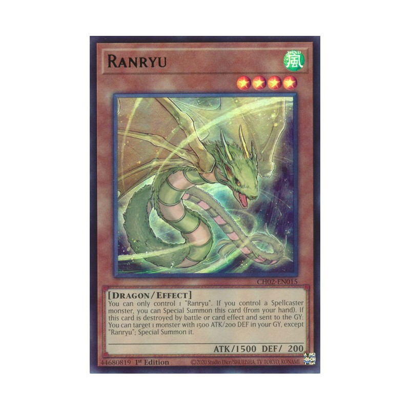 Texto (EN): You can only control 1 "Ranryu". If you control a Spellcaster monster, you can Special Summon this card (from your hand). If this card is destroyed by battle or card effect and sent to the GY: You can target 1 monster with 1500 ATK/200 DEF in your GY, except "Ranryu"; Special Summon it.