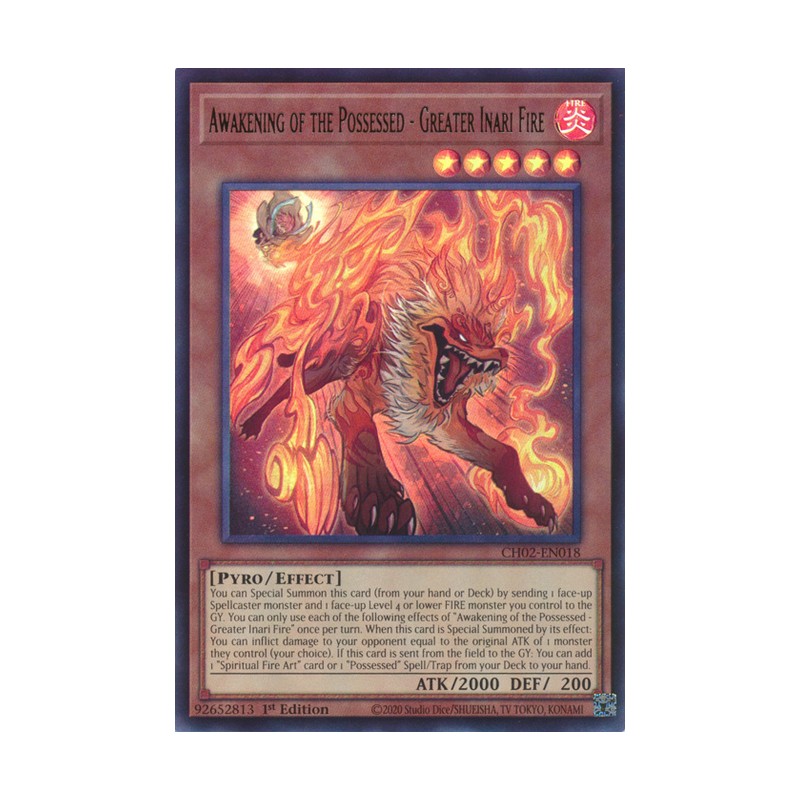 Texto (EN): You can Special Summon this card (from your hand or Deck) by sending 1 face-up Spellcaster monster and 1 face-up Level 4 or lower FIRE monster you control to the GY. You can only use each of the following effects of "Awakening of the Possessed - Greater Inari Fire" once per turn. When this card is Special Summoned by its effect: You can inflict damage to your opponent equal to the original ATK of 1 monster they control (your choice). If this card is sent from the field to the GY: You can add 1 "Spiritual Fire Art" card or 1 "Possessed" Spell/Trap from your Deck to your hand.