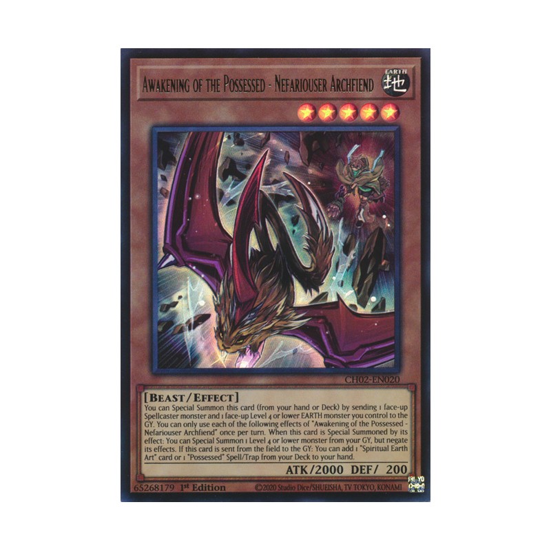 Texto (EN): You can Special Summon this card (from your hand or Deck) by sending 1 face-up Spellcaster monster and 1 face-up Level 4 or lower EARTH monster you control to the GY. You can only use each of the following effects of "Awakening of the Possessed - Nefariouser Archfiend" once per turn. When this card is Special Summoned by its effect: You can Special Summon 1 Level 4 or lower monster from your GY, but negate its effects. If this card is sent from the field to the GY: You can add 1 "Spiritual Earth Art" card or 1 "Possessed" Spell/Trap from your Deck to your hand.