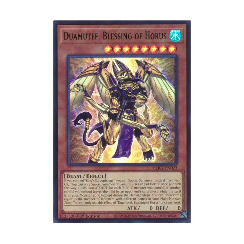 Texto (EN): If you control "King's Sarcophagus", you can Special Summon this card (from your GY). You can only Special Summon "Duamutef, Blessing of Horus" once per turn this way. Gains 1200 ATK/DEF for each "Horus" monster you control. If another card(s) you control leaves the field by an opponent's card effect, while this card is in your Monster Zone (except during the Damage Step): You can draw cards equal to the number of monsters with different names in your Main Monster Zone. You can only use this effect of "Duamutef, Blessing of Horus" once per turn.