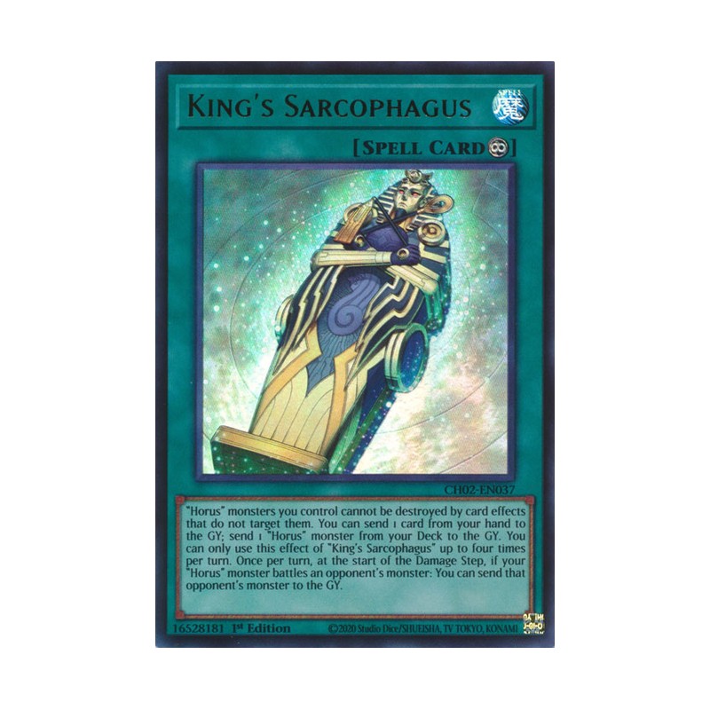 Texto (EN): "Horus" monsters you control cannot be destroyed by card effects that do not target them. You can send 1 card from your hand to the GY; send 1 "Horus" monster from your Deck to the GY. You can only use this effect of "King's Sarcophagus" up to four times per turn. Once per turn, at the start of the Damage Step, if your "Horus" monster battles an opponent's monster: You can send that opponent's monster to the GY.
