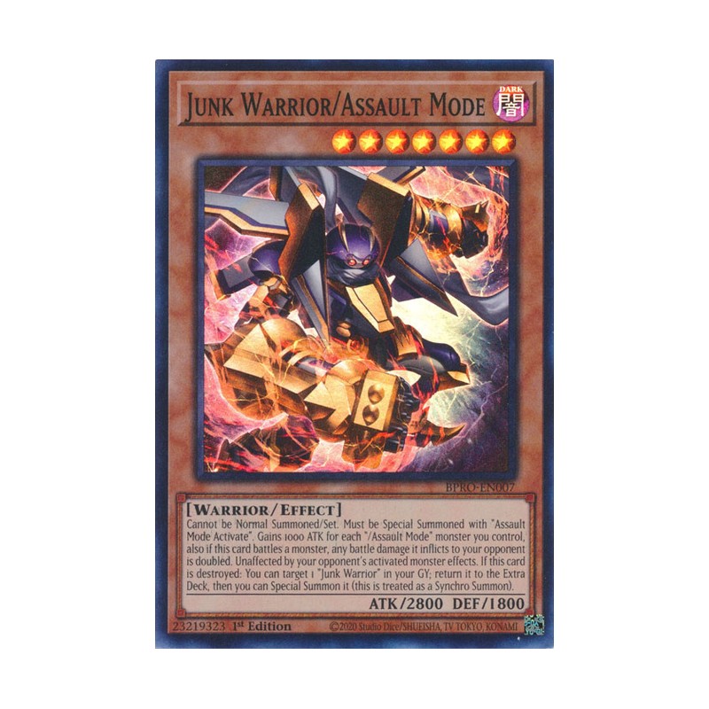 Texto (EN): Cannot be Normal Summoned/Set. Must be Special Summoned with "Assault Mode Activate". Gains 1000 ATK for each "/Assault Mode" monster you control, also if this card battles a monster, any battle damage it inflicts to your opponent is doubled. Unaffected by your opponent's activated monster effects. If this card is destroyed: You can target 1 "Junk Warrior" in your GY; return it to the Extra Deck, then you can Special Summon it (this is treated as a Synchro Summon).