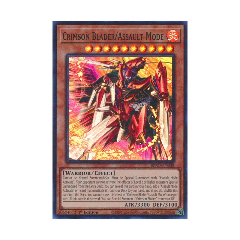 Texto (EN): Cannot be Normal Summoned/Set. Must be Special Summoned with "Assault Mode Activate". Your opponent cannot activate the effects of Level 5 or higher monsters Special Summoned from the Extra Deck. You can reveal this card in your hand; add 1 "Assault Mode Activate" or 1 card that mentions it from your Deck to your hand, and if you do, shuffle this card into the Deck. You can only use this effect of "Crimson Blader/Assault Mode" once per turn. If this card is destroyed: You can Special Summon 1 "Crimson Blader" from your GY.