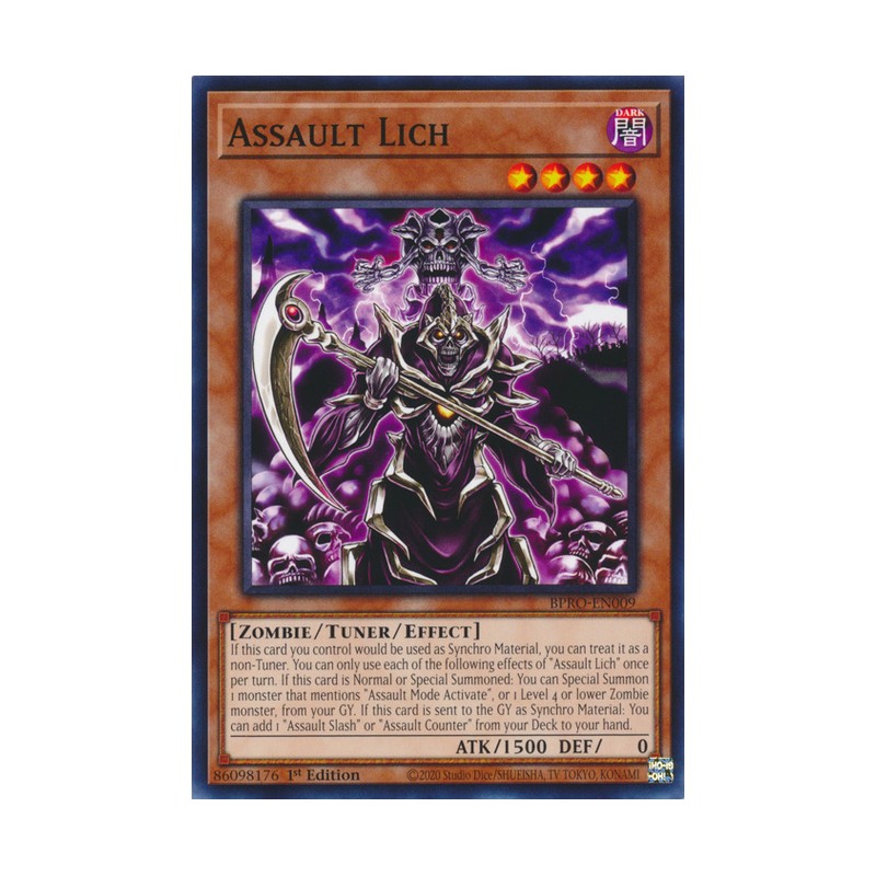 Texto (EN): If this card you control would be used as Synchro Material, you can treat it as a non-Tuner. You can only use each of the following effects of "Assault Lich" once per turn. If this card is Normal or Special Summoned: You can Special Summon 1 monster that mentions "Assault Mode Activate", or 1 Level 4 or lower Zombie monster, from your GY. If this card is sent to the GY as Synchro Material: You can add 1 "Assault Slash" or "Assault Counter" from your Deck to your hand.