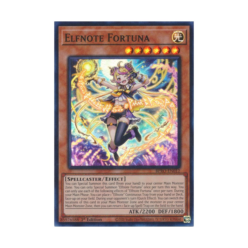 Texto (EN): You can Special Summon this card (from your hand) to your center Main Monster Zone. You can only Special Summon "Elfnote Fortuna" once per turn this way. You can only use each of the following effects of "Elfnote Fortuna" once per turn. During your Main Phase: You can place 1 "Elfnote" Continuous Trap from your hand or Deck, face-up on your field. During your opponent's turn (Quick Effect): You can switch the locations of this card in your Main Monster Zone and the monster in your center Main Monster Zone, then you can return 1 face-up Spell/Trap on the field to the hand.