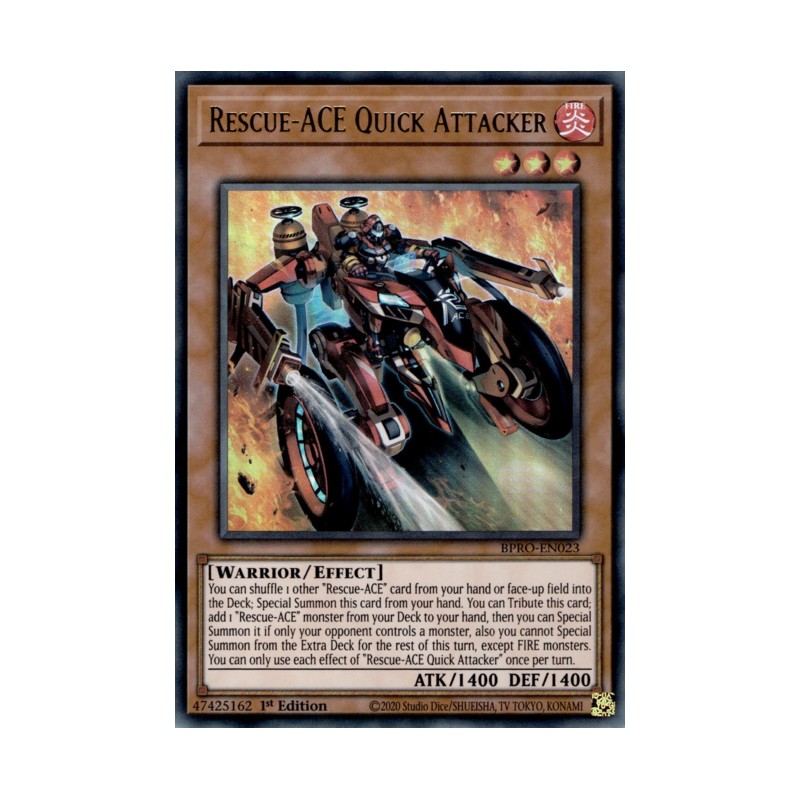 Texto (EN): You can shuffle 1 other "Rescue-ACE" card from your hand or face-up field into the Deck; Special Summon this card from your hand. You can Tribute this card; add 1 "Rescue-ACE" monster from your Deck to your hand, then you can Special Summon it if only your opponent controls a monster, also you cannot Special Summon from the Extra Deck for the rest of this turn, except FIRE monsters. You can only use each effect of "Rescue-ACE Quick Attacker" once per turn.