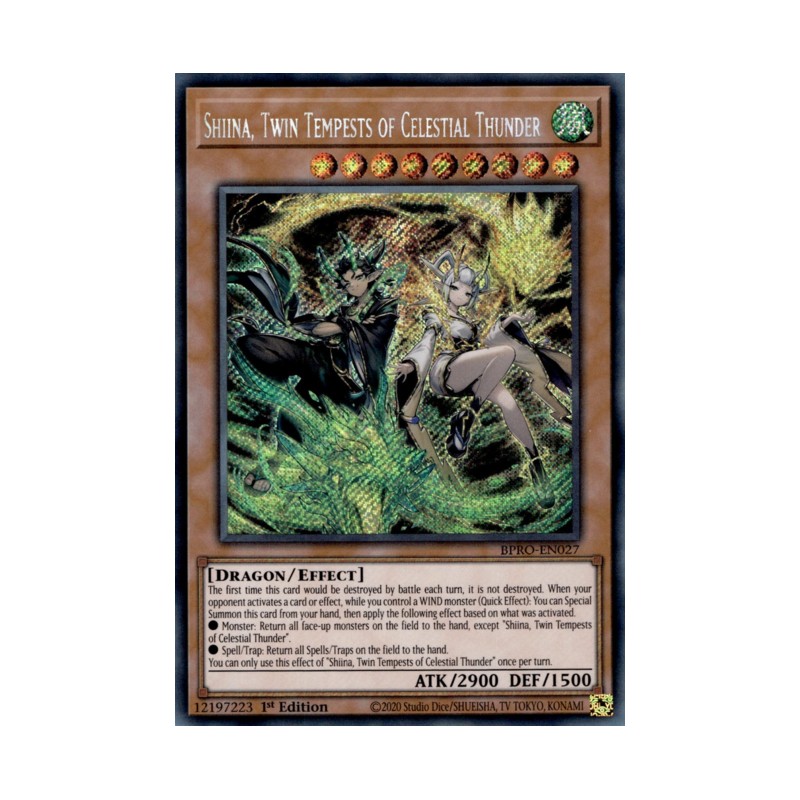 Texto (EN): The first time this card would be destroyed by battle each turn, it is not destroyed. When your opponent activates a card or effect, while you control a WIND monster (Quick Effect): You can Special Summon this card from your hand, then apply the following effect based on what was activated. ● Monster: Return all face-up monsters on the field to the hand, except "Shiina, Twin Tempests of Celestial Thunder". ● Spell/Trap: Return all Spells/Traps on the field to the hand. You can only use this effect of "Shiina, Twin Tempests of Celestial Thunder" once per turn.