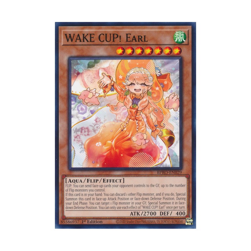 Texto (EN): FLIP: You can send face-up cards your opponent controls to the GY, up to the number of Flip monsters you control. If this card is in your hand: You can discard 1 other Flip monster, and if you do, Special Summon this card in face-up Attack Position or face-down Defense Position. During your End Phase: You can target 1 Flip monster in your GY; Special Summon it in face-down Defense Position. You can only use each effect of "WAKE CUP! Earl" once per turn.