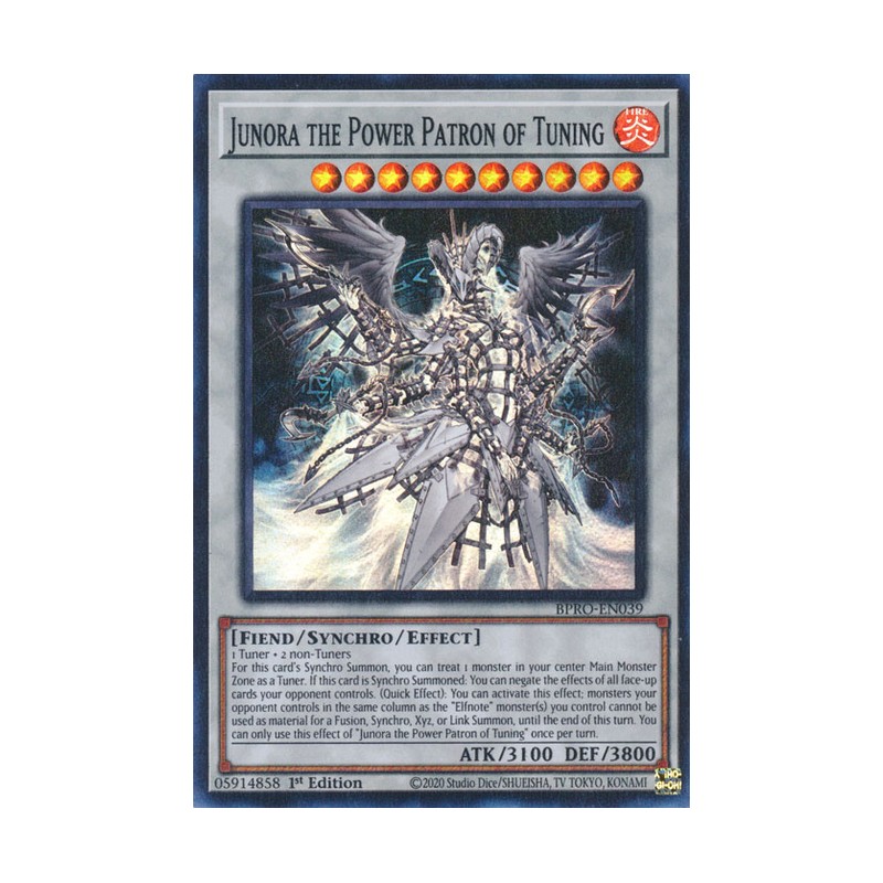 Texto (EN): 1 Tuner + 2 non-Tuners For this card's Synchro Summon, you can treat 1 monster in your center Main Monster Zone as a Tuner. If this card is Synchro Summoned: You can negate the effects of all face-up cards your opponent controls. (Quick Effect): You can activate this effect; monsters your opponent controls in the same column as the "Elfnote" monster(s) you control cannot be used as material for a Fusion, Synchro, Xyz, or Link Summon, until the end of this turn. You can only use this effect of "Junora the Power Patron of Tuning" once per turn.