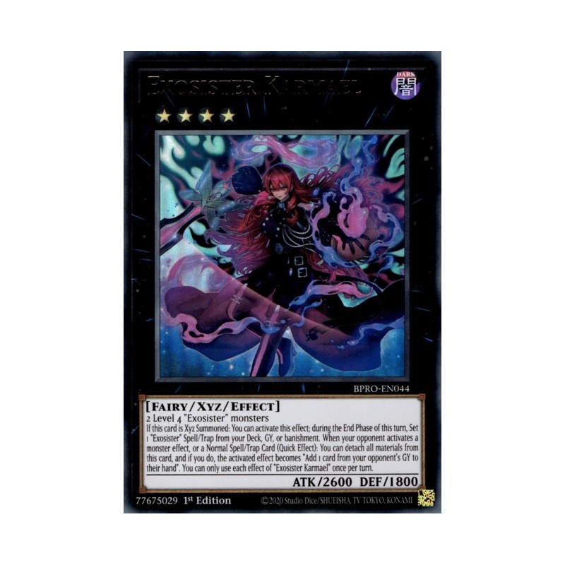 Texto (EN): 2 Level 4 "Exosister" monsters If this card is Xyz Summoned: You can activate this effect; during the End Phase of this turn, Set 1 "Exosister" Spell/Trap from your Deck, GY, or banishment. When your opponent activates a monster effect, or a Normal Spell/Trap Card (Quick Effect): You can detach all materials from this card, and if you do, the activated effect becomes "Add 1 card from your opponent's GY to their hand". You can only use each effect of "Exosister Karmael" once per turn.