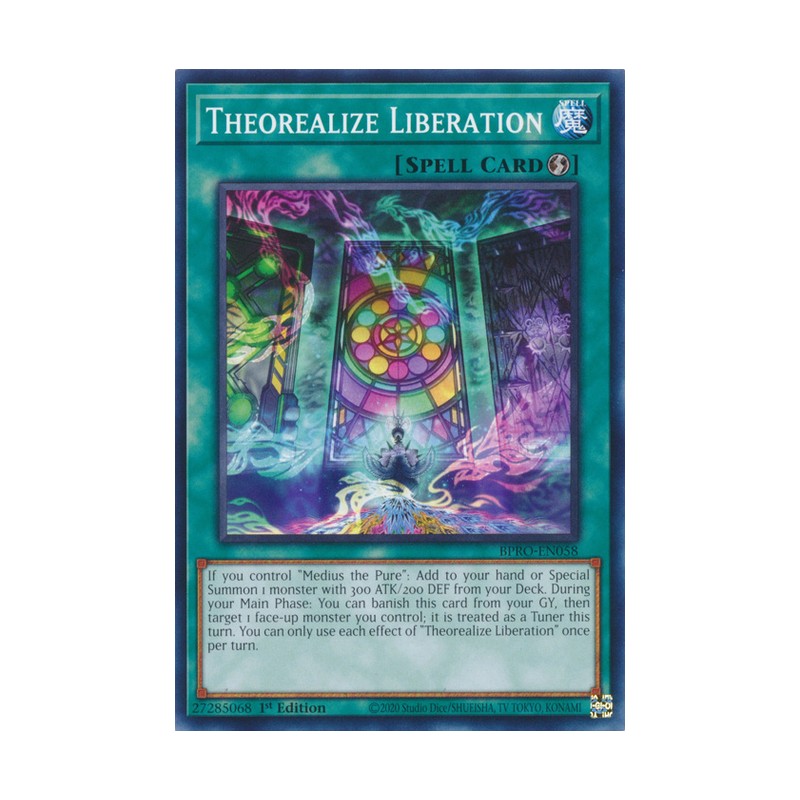 Texto (EN): If you control "Medius the Pure": Add to your hand or Special Summon 1 monster with 300 ATK/200 DEF from your Deck. During your Main Phase: You can banish this card from your GY, then target 1 face-up monster you control; it is treated as a Tuner this turn. You can only use each effect of "Theorealize Liberation" once per turn.