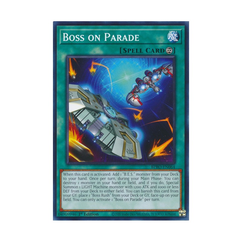 Texto (EN): When this card is activated: Add 1 "B.E.S." monster from your Deck to your hand. Once per turn, during your Main Phase: You can destroy 1 monster in your hand or field, and if you do, Special Summon 1 LIGHT Machine monster with 1200 ATK and 1000 or less DEF from your Deck to either field. You can banish this card from your GY; place 1 "Boss Rush" from your Deck or GY, face-up on your field. You can only activate 1 "Boss on Parade" per turn.