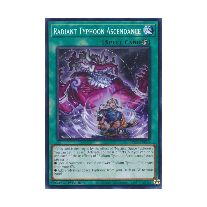 Texto (EN): If this card is destroyed by the effect of "Mystical Space Typhoon": You can Set this card. Activate 1 of these effects (but you can only use each of these effects of "Radiant Typhoon Ascendance" once per turn); ● Special Summon 1 Level 6 or lower "Radiant Typhoon" monster from your GY. ● Add 1 "Mystical Space Typhoon" from your Deck or GY to your hand.