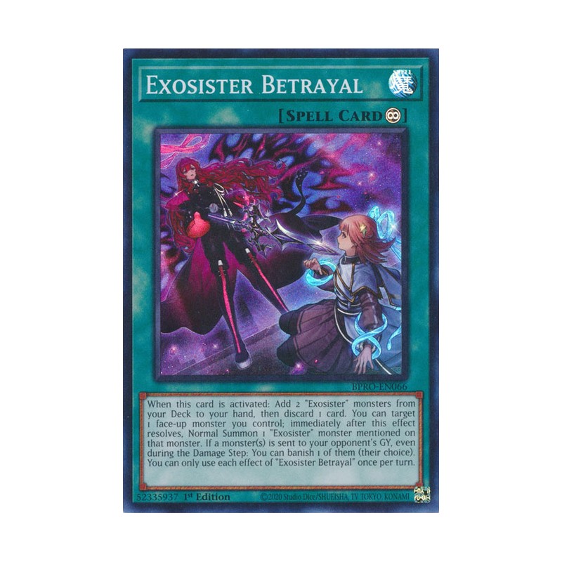 Texto (EN): When this card is activated: Add 2 "Exosister" monsters from your Deck to your hand, then discard 1 card. You can target 1 face-up monster you control; immediately after this effect resolves, Normal Summon 1 "Exosister" monster mentioned on that monster. If a monster(s) is sent to your opponent's GY, even during the Damage Step: You can activate this effect; your opponent banishes 1 of them. You can only use each effect of "Exosister Betrayal" once per turn.