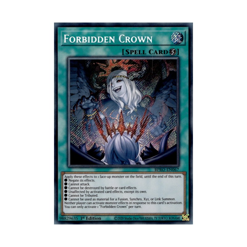 Texto (EN): Apply these effects to 1 face-up monster on the field, until the end of this turn. ● Negate its effects. ● Cannot attack. ● Cannot be destroyed by battle or card effects. ● Unaffected by activated card effects, except its own. ● Cannot be Tributed. ● Cannot be used as material for a Fusion, Synchro, Xyz, or Link Summon. Neither player can activate monster effects in response to this card's activation. You can only activate 1 "Forbidden Crown" per turn.