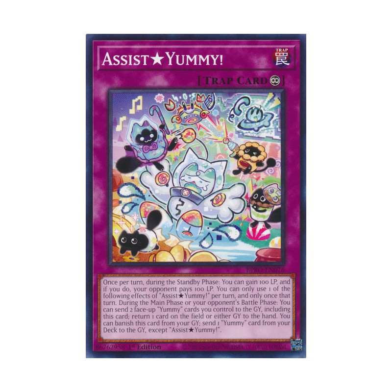 Texto (EN): Once per turn, during the Standby Phase: You can gain 100 LP, and if you do, your opponent pays 100 LP. You can only use 1 of the following effects of "Assist★Yummy!" per turn, and only once that turn. During the Main Phase or your opponent's Battle Phase: You can send 2 face-up "Yummy" cards you control to the GY, including this card; return 1 card on the field or either GY to the hand. You can banish this card from your GY; send 1 "Yummy" card from your Deck to the GY, except "Assist★Yummy!".