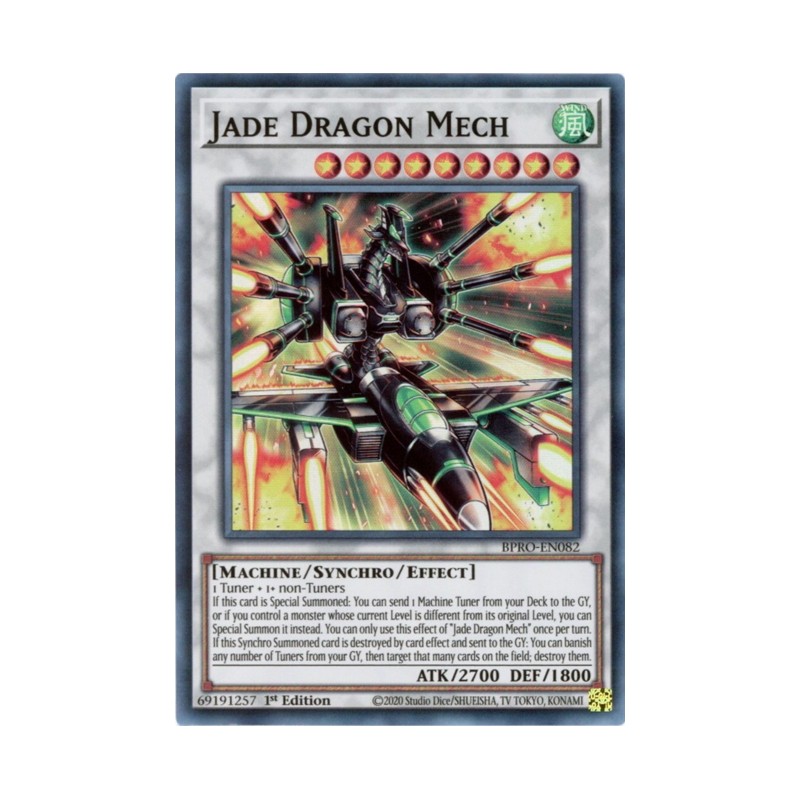 Texto (EN): 1 Tuner + 1+ non-Tuners If this card is Special Summoned: You can send 1 Machine Tuner from your Deck to the GY, or if you control a monster whose current Level is different from its original Level, you can Special Summon it instead. You can only use this effect of "Jade Dragon Mech" once per turn. If this Synchro Summoned card is destroyed by card effect and sent to the GY: You can banish any number of Tuners from your GY, then target that many cards on the field; destroy them.