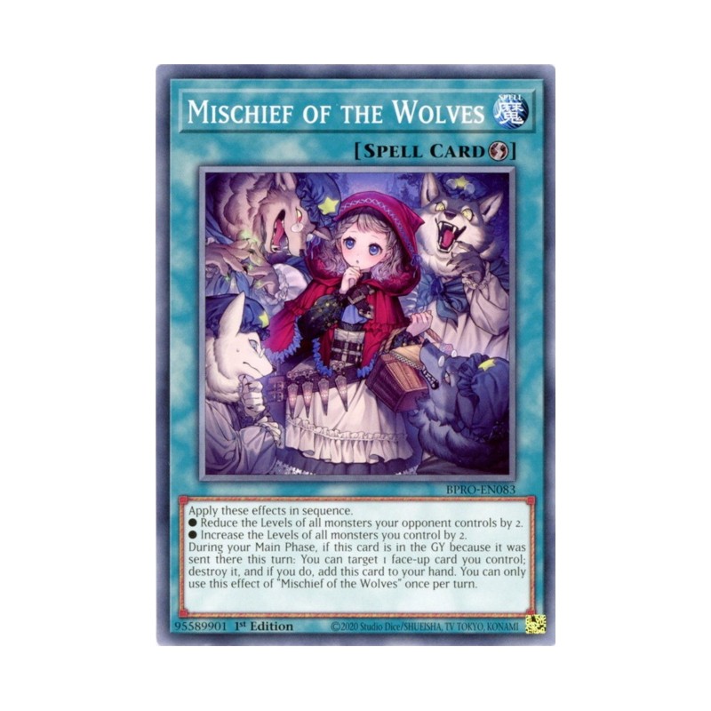 Texto (EN): Apply these effects in sequence. ● Reduce the Levels of all monsters your opponent controls by 2. ● Increase the Levels of all monsters you control by 2. During your Main Phase, if this card is in the GY because it was sent there this turn: You can target 1 face-up card you control; destroy it, and if you do, add this card to your hand. You can only use this effect of "Mischief of the Wolves" once per turn.