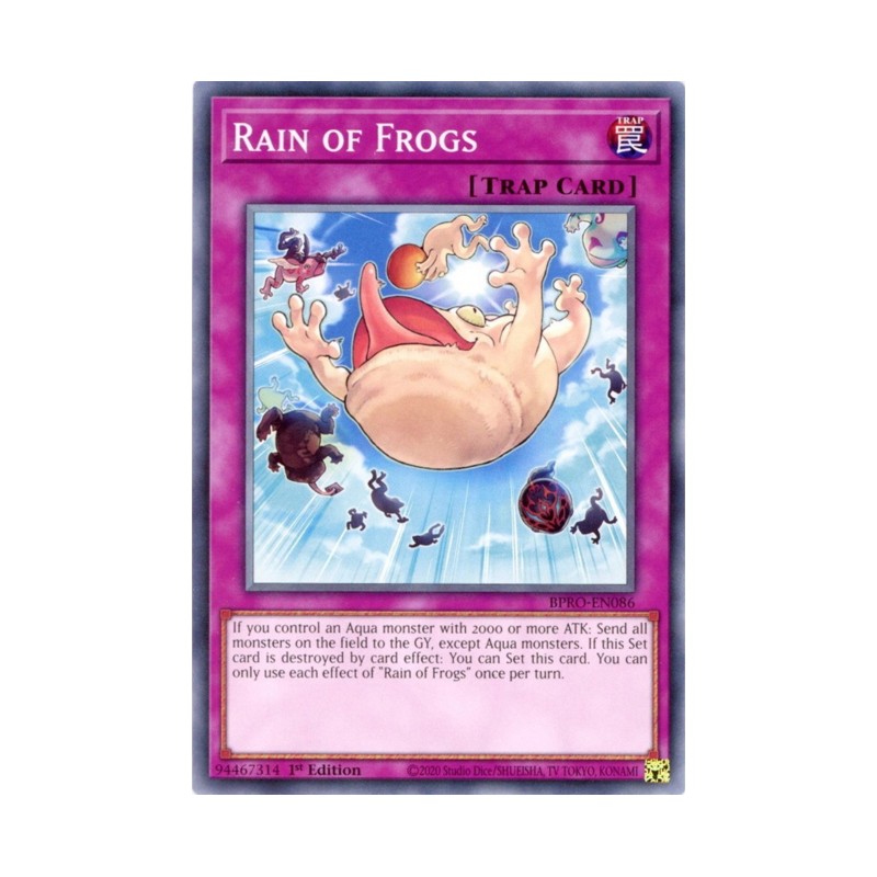 Texto (EN): If you control an Aqua monster with 2000 or more ATK: Send all monsters on the field to the GY, except Aqua monsters. If this Set card is destroyed by card effect: You can Set this card. You can only use each effect of "Rain of Frogs" once per turn.