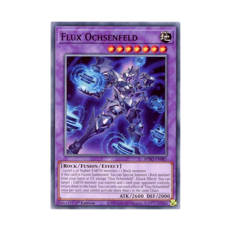 Texto (EN): 1 Level 5 or higher EARTH monster + 1 Rock monster If this card is Fusion Summoned: You can Special Summon 1 Rock monster from your hand or GY, except "Flux Ochsenfeld". (Quick Effect): You can target 1 EARTH monster you control and 1 card your opponent controls; return them to the hand. You can only use each effect of "Flux Ochsenfeld" once per turn, and cannot activate more than 1 in the same Chain.
