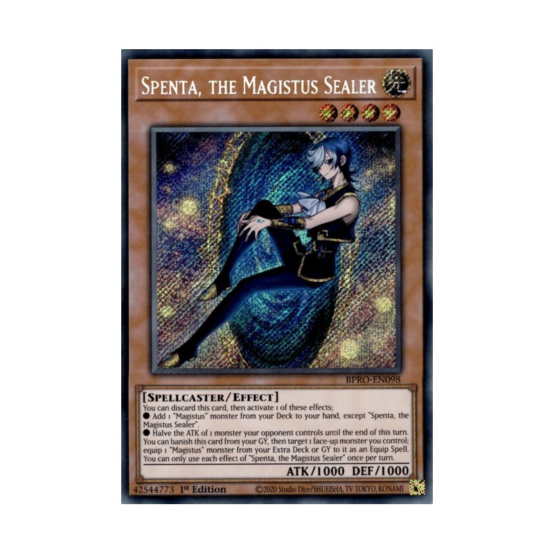 Texto (EN): You can discard this card, then activate 1 of these effects; ● Add 1 "Magistus" monster from your Deck to your hand, except "Spenta, the Magistus Sealer". ● Halve the ATK of 1 monster your opponent controls until the end of this turn. You can banish this card from your GY, then target 1 face-up monster you control; equip 1 "Magistus" monster from your Extra Deck or GY to it as an Equip Spell. You can only use each effect of "Spenta, the Magistus Sealer" once per turn.
