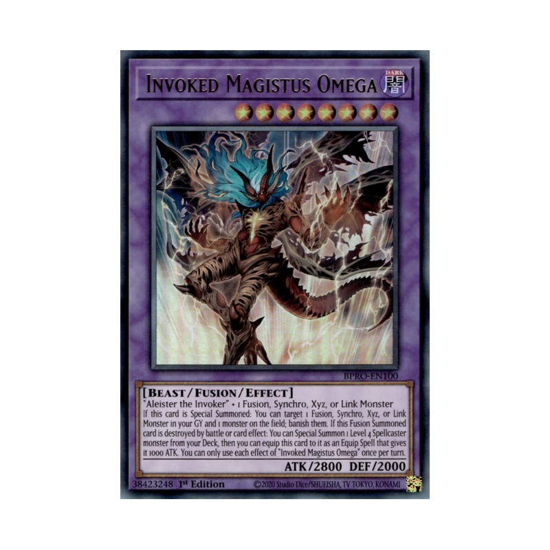 Texto (EN): "Aleister the Invoker" + 1 Fusion, Synchro, Xyz, or Link Monster If this card is Special Summoned: You can target 1 Fusion, Synchro, Xyz, or Link Monster in your GY and 1 monster on the field; banish them. If this Fusion Summoned card is destroyed by battle or card effect: You can Special Summon 1 Level 4 Spellcaster monster from your Deck, then you can equip this card to it as an Equip Spell that gives it 1000 ATK. You can only use each effect of "Invoked Magistus Omega" once per turn.