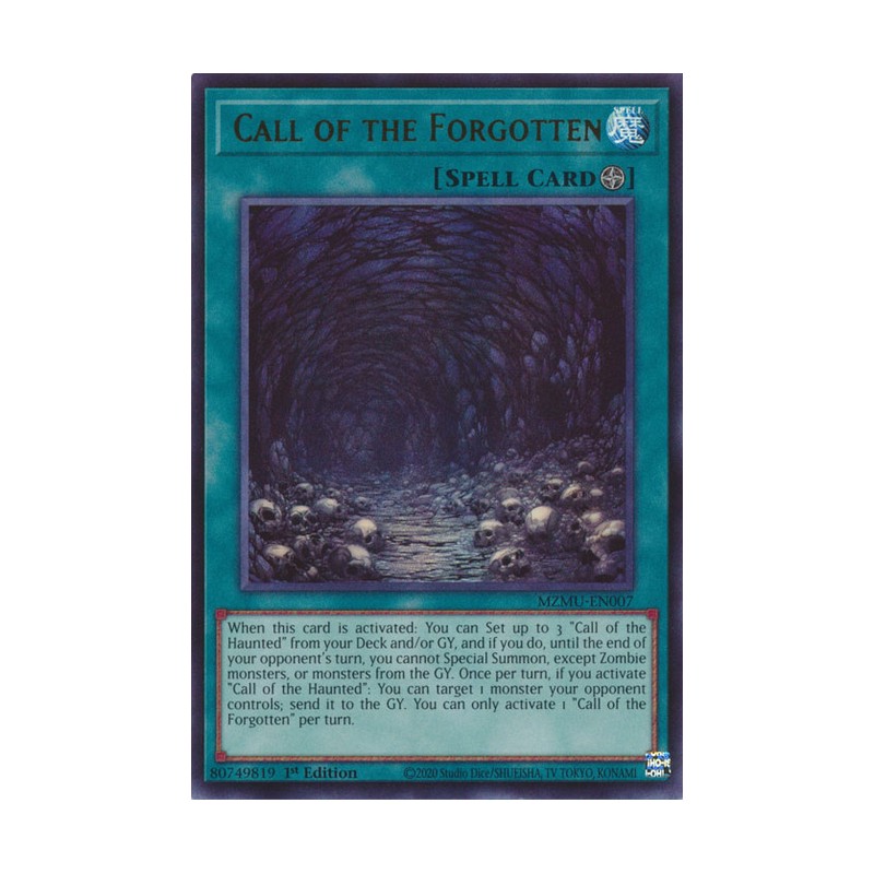 Texto (EN): When this card is activated: You can Set up to 3 "Call of the Haunted" from your Deck and/or GY, and if you do, until the end of your opponent's turn, you cannot Special Summon, except Zombie monsters, or monsters from the GY. Once per turn, if you activate "Call of the Haunted": You can target 1 monster your opponent controls; send it to the GY. You can only activate 1 "Call of the Forgotten" per turn.