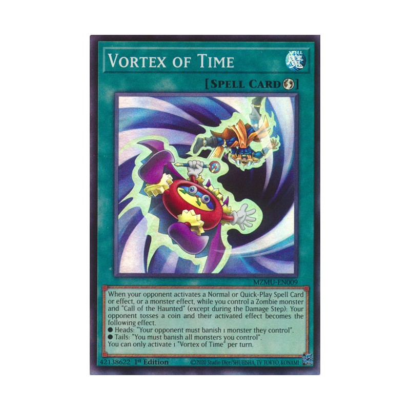Texto (EN): When your opponent activates a Normal or Quick-Play Spell Card or effect, or a monster effect, while you control a Zombie monster and "Call of the Haunted" (except during the Damage Step): Your opponent tosses a coin and their activated effect becomes the following effect. ● Heads: "Your opponent must banish 1 monster they control". ● Tails: "You must banish all monsters you control". You can only activate 1 "Vortex of Time" per turn.