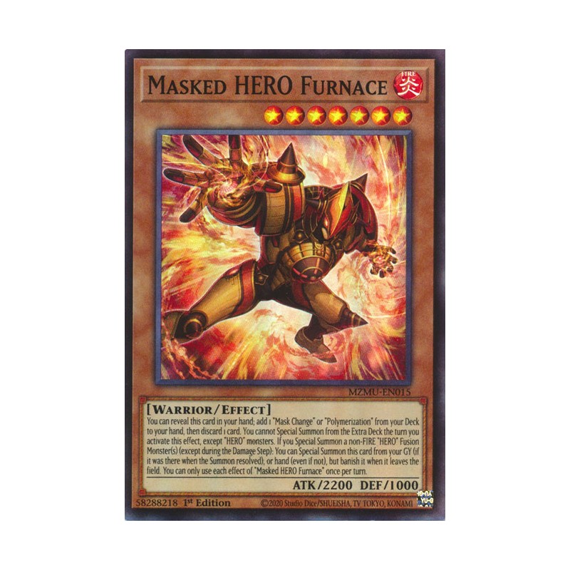 Texto (EN): You can reveal this card in your hand; add 1 "Mask Change" or "Polymerization" from your Deck to your hand, then discard 1 card. You cannot Special Summon from the Extra Deck the turn you activate this effect, except "HERO" monsters. If you Special Summon a non-FIRE "HERO" Fusion Monster(s) (except during the Damage Step): You can Special Summon this card from your GY (if it was there when the Summon resolved), or hand (even if not), but banish it when it leaves the field. You can only use each effect of "Masked HERO Furnace" once per turn.