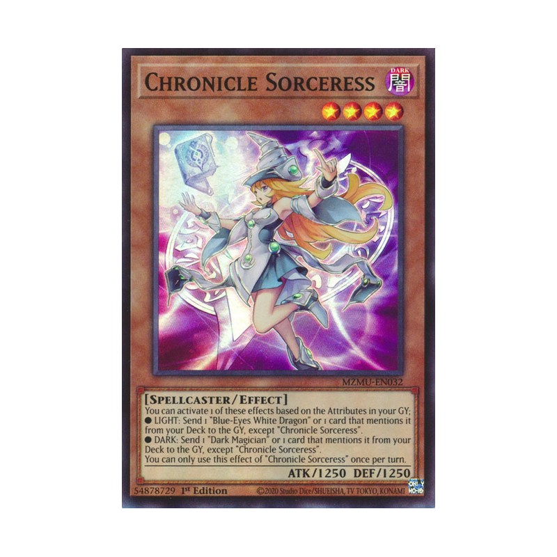 Texto (EN): You can activate 1 of these effects based on the Attributes in your GY; ● LIGHT: Send 1 "Blue-Eyes White Dragon" or 1 card that mentions it from your Deck to the GY, except "Chronicle Sorceress". ● DARK: Send 1 "Dark Magician" or 1 card that mentions it from your Deck to the GY, except "Chronicle Sorceress". You can only use this effect of "Chronicle Sorceress" once per turn.