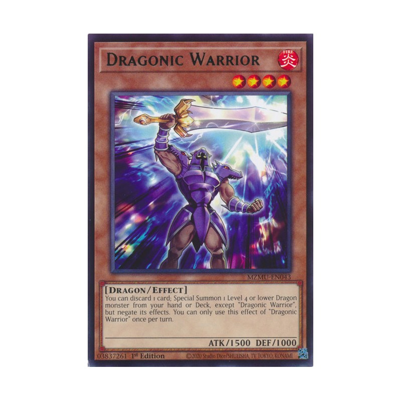 Texto (EN): You can discard 1 card; Special Summon 1 Level 4 or lower Dragon monster from your hand or Deck, except "Dragonic Warrior", but negate its effects. You can only use this effect of "Dragonic Warrior" once per turn.