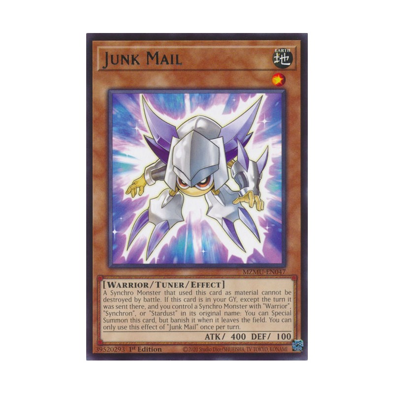 Texto (EN): A Synchro Monster that used this card as material cannot be destroyed by battle. If this card is in your GY, except the turn it was sent there, and you control a Synchro Monster with "Warrior", "Synchron", or "Stardust" in its original name: You can Special Summon this card, but banish it when it leaves the field. You can only use this effect of "Junk Mail" once per turn.