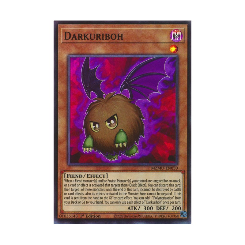 Texto (EN): When a Fiend monster(s) and/or Fusion Monster(s) you control are targeted for an attack, or a card or effect is activated that targets them (Quick Effect): You can discard this card, then target 1 of those monsters; until the end of this turn, it cannot be destroyed by battle or card effects, also its effects activated in the Monster Zone cannot be negated. If this card is sent from the hand to the GY by card effect: You can add 1 "Polymerization" from your Deck or GY to your hand. You can only use each effect of "Darkuriboh" once per turn.