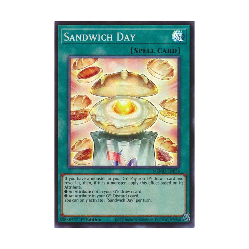Texto (EN): If you have a monster in your GY: Pay 200 LP; draw 1 card and reveal it, then, if it is a monster, apply this effect based on its Attribute. ● An Attribute not in your GY: Draw 1 card. ● An Attribute in your GY: Discard 1 card. You can only activate 1 "Sandwich Day" per turn.
