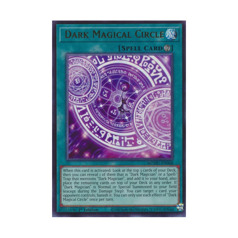 Texto (EN): When this card is activated: Look at the top 3 cards of your Deck, then you can reveal 1 of them that is "Dark Magician" or a Spell/Trap that mentions "Dark Magician", and add it to your hand, also place the remaining cards on top of your Deck in any order. If "Dark Magician" is Normal or Special Summoned to your field (except during the Damage Step): You can target 1 card your opponent controls; banish it. You can only use each effect of "Dark Magical Circle" once per turn.