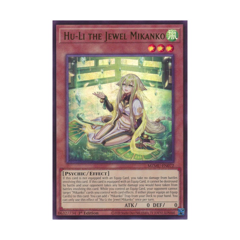 Texto (EN): If this card is not equipped with an Equip Card, you take no damage from battles involving this card. If this card is equipped with an Equip Card, it cannot be destroyed by battle and your opponent takes any battle damage you would have taken from battles involving this card. While you control an Equip Card, your opponent cannot target "Mikanko" cards you control with card effects. If either player equips an Equip Card(s) to this card: You can add 1 "Mikanko" Trap from your Deck to your hand. You can only use this effect of "Hu-Li the Jewel Mikanko" once per turn.