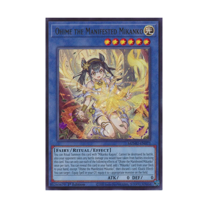 Texto (EN): You can Ritual Summon this card with "Mikanko Kagura". Cannot be destroyed by battle, also your opponent takes any battle damage you would have taken from battles involving this card. You can only use each of the following effects of "Ohime the Manifested Mikanko" once per turn. You can reveal this card in your hand; add 1 "Mikanko" card from your Deck to your hand, except "Ohime the Manifested Mikanko", then discard 1 card. (Quick Effect): You can target 1 Equip Spell in your GY; equip it to 1 appropriate monster on the field.