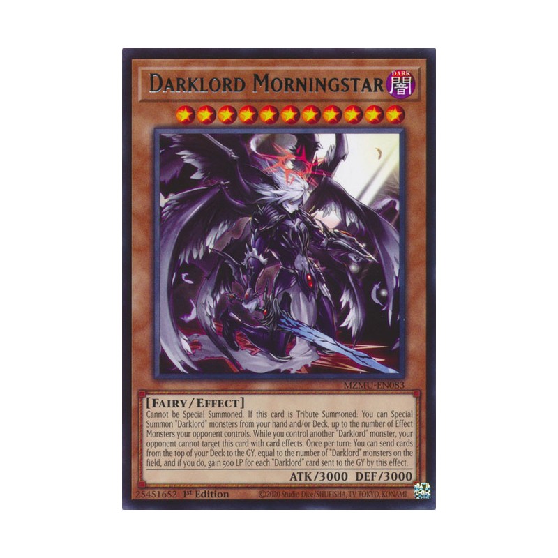 Texto (EN): Cannot be Special Summoned. If this card is Tribute Summoned: You can Special Summon "Darklord" monsters from your hand and/or Deck, up to the number of Effect Monsters your opponent controls. While you control another "Darklord" monster, your opponent cannot target this card with card effects. Once per turn: You can send cards from the top of your Deck to the GY, equal to the number of "Darklord" monsters on the field, and if you do, gain 500 LP for each "Darklord" card sent to the GY by this effect.