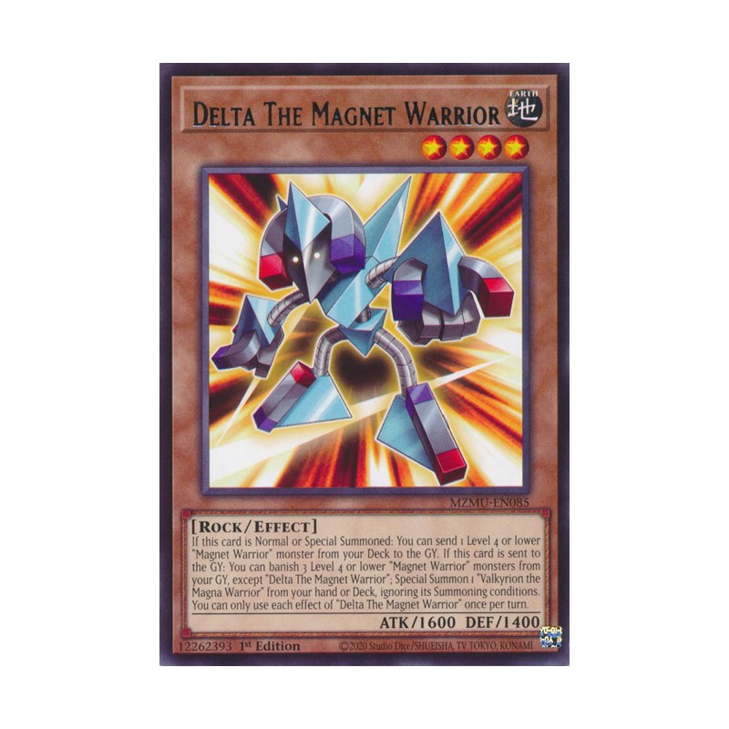 Texto (EN): If this card is Normal or Special Summoned: You can send 1 Level 4 or lower "Magnet Warrior" monster from your Deck to the GY. If this card is sent to the GY: You can banish 3 Level 4 or lower "Magnet Warrior" monsters from your GY, except "Delta The Magnet Warrior"; Special Summon 1 "Valkyrion the Magna Warrior" from your hand or Deck, ignoring its Summoning conditions. You can only use each effect of "Delta The Magnet Warrior" once per turn.