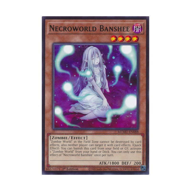 Texto (EN): "Zombie World" in the Field Zone cannot be destroyed by card effects, also neither player can target it with card effects. (Quick Effect): You can banish this card from your field or GY; activate 1 "Zombie World" directly from your hand or Deck. You can only use this effect of "Necroworld Banshee" once per turn.