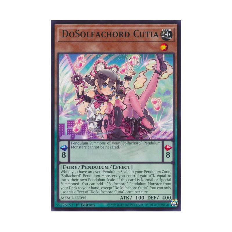 Texto (EN): Pendulum Effect Pendulum Summons of your "Solfachord" Pendulum Monsters cannot be negated. Monster Effect While you have an even Pendulum Scale in your Pendulum Zone, "Solfachord" Pendulum Monsters you control gain ATK equal to 100 x their own Pendulum Scale. If this card is Normal or Special Summoned: You can add 1 "Solfachord" Pendulum Monster from your Deck to your hand, except "DoSolfachord Cutia". You can only use this effect of "DoSolfachord Cutia" once per turn.