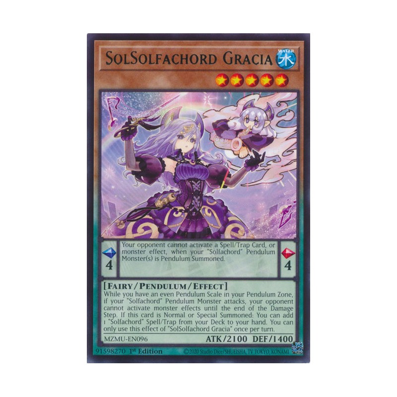 Texto (EN): Pendulum Effect Your opponent cannot activate a Spell/Trap Card, or monster effect, when your "Solfachord" Pendulum Monster(s) is Pendulum Summoned. Monster Effect While you have an even Pendulum Scale in your Pendulum Zone, if your "Solfachord" Pendulum Monster attacks, your opponent cannot activate monster effects until the end of the Damage Step. If this card is Normal or Special Summoned: You can add 1 "Solfachord" Spell/Trap from your Deck to your hand. You can only use this effect of "SolSolfachord Gracia" once per turn.