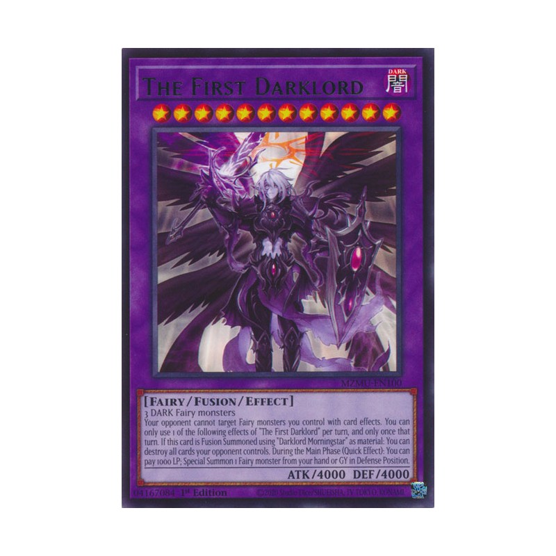 Texto (EN): 3 DARK Fairy monsters Your opponent cannot target Fairy monsters you control with card effects. You can only use 1 of the following effects of "The First Darklord" per turn, and only once that turn. ● If this card is Fusion Summoned using "Darklord Morningstar" as material: You can destroy all cards your opponent controls. ● During the Main Phase (Quick Effect): You can pay 1000 LP; Special Summon 1 Fairy monster from your hand or GY in Defense Position.